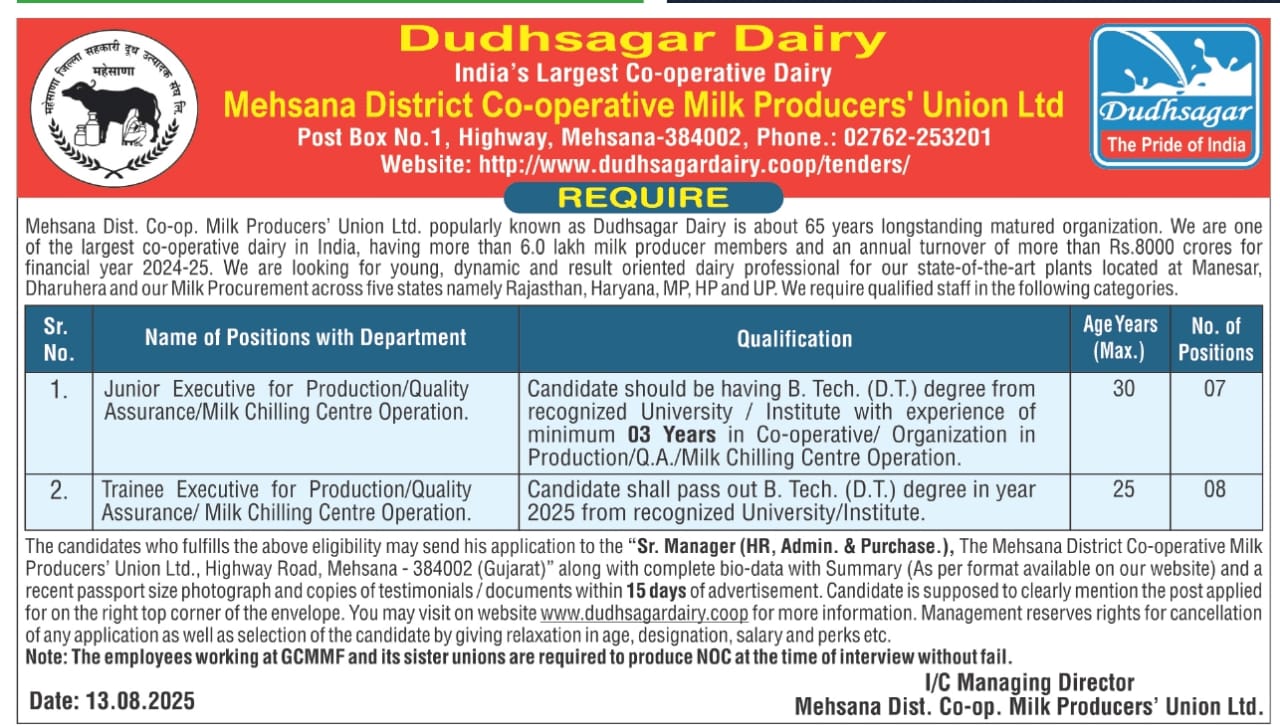 - ઓગનાઈઝ્ડ યુનિવર્સિટી/ઇન્સ્ટિટ્યુટથી B. Tech. (D.T.) ડિગ્રી સાથે ઓછામાં ઓછા 03 વર્ષનો અનુભવ (પ્રોડક્શન/ક્વોલિટી એશ્યોરન્સ/દૂધ ઠંડક કેન્દ્ર ઑપરેશનમાં).