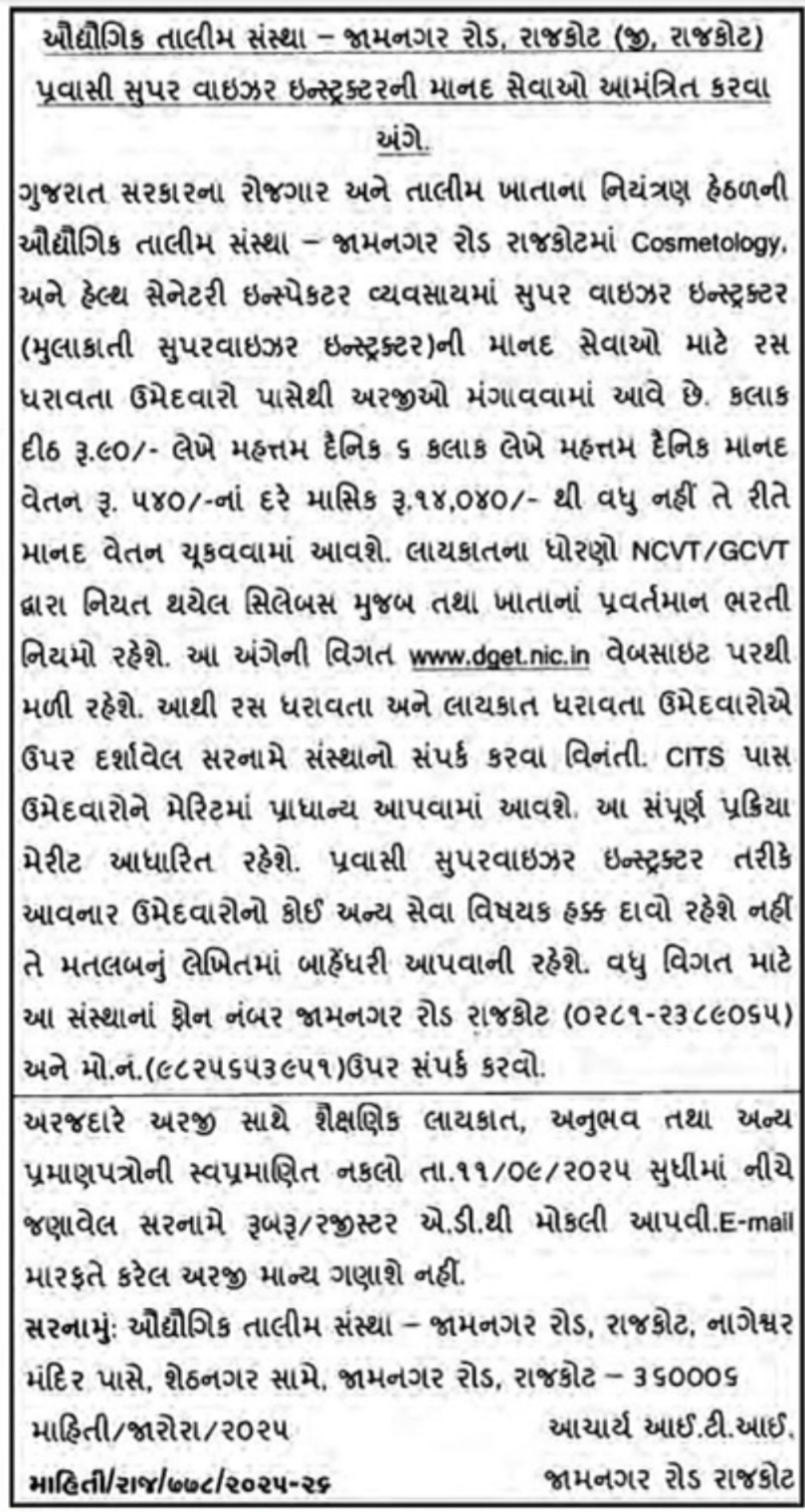ITI રાજકોટ દ્વારા જાહેરાત માં 25 ઑગસ્ટ 2025 ના રોજ બહાર પાડવામાં આવી છે. આ ભરતી માટે અરજી કરવાની અંતિમ તારીખ 11 સપ્ટેમ્બર 2025 નિશ્ચિત કરવામાં આવી છે. જો તમે આ શાનદાર તકનો લાભ લઈને ભરતી પ્રક્રિયામાં સામેલ થવા માગતા હો, તો અમારી નમ્ર સલાહ છે કે તમે નિર્ધારિત સમયમર્યાદા પહેલાં તમારી અરજી તૈયાર કરીને સબમિટ કરી દો, કેમ કે એકવાર છેલ્લી તારીખ વીતી ગયા પછી કોઈપણ પ્રકારની અરજીઓને માન્યતા આપવામાં આવશે નહીં.