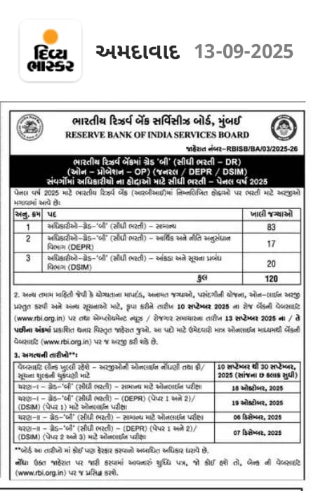 ભારતીય રિઝર્વ બેંક દ્વારા જાહેરાત માં 10 સપ્ટેમ્બર 2025 ના રોજ બહાર પાડવામાં આવી છે. આ ભરતી માટે અરજી કરવાની અંતિમ તારીખ 30 સપ્ટેમ્બર 2025 નિશ્ચિત કરવામાં આવી છે. જો તમે આ શાનદાર તકનો લાભ લઈને ભરતી પ્રક્રિયામાં સામેલ થવા માગતા હો, તો અમારી નમ્ર સલાહ છે કે તમે નિર્ધારિત સમયમર્યાદા પહેલાં તમારી અરજી તૈયાર કરીને સબમિટ કરી દો, કેમ કે એકવાર છેલ્લી તારીખ વીતી ગયા પછી કોઈપણ પ્રકારની અરજીઓને માન્યતા આપવામાં આવશે નહીં.